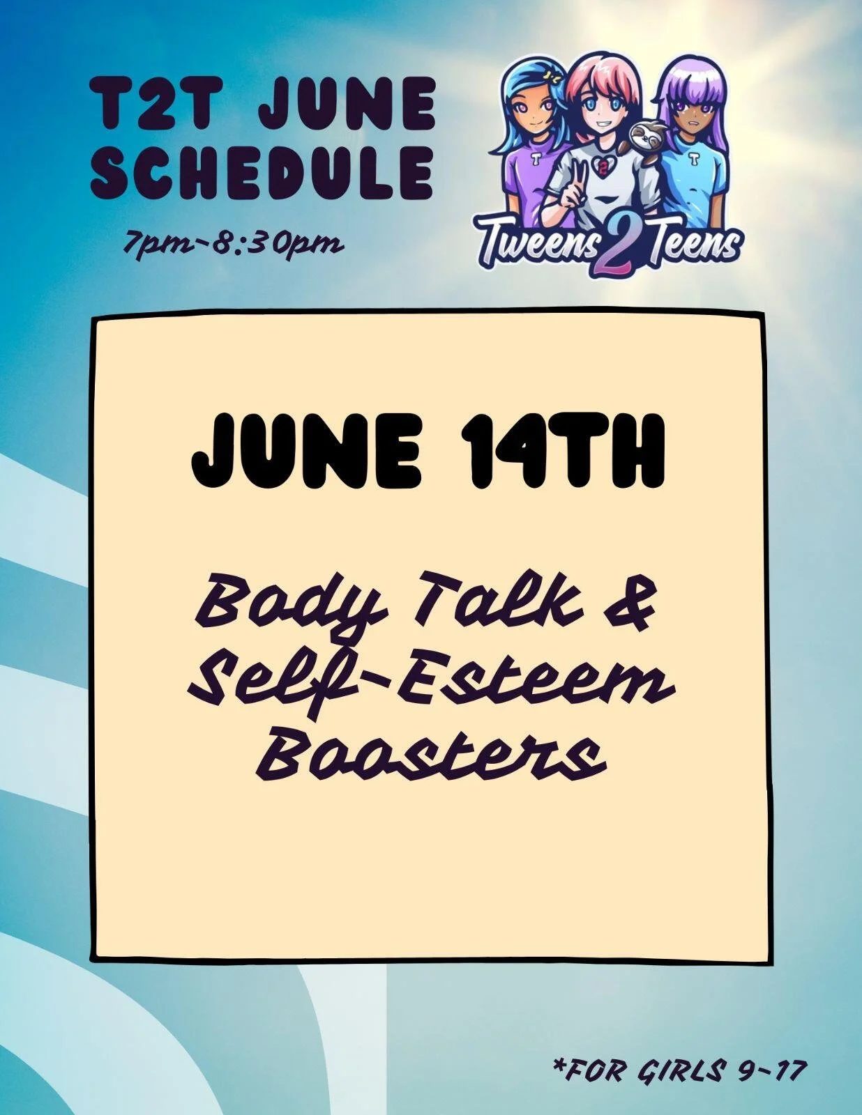 Body Talk & Self Esteem Boosters Friday, June 14, 2024 7:00 PM 8:30 PM Tweens 2 Teens 1125 South Rock Road Wichita, KS, 67207 United States (map) Google Calendar ICS