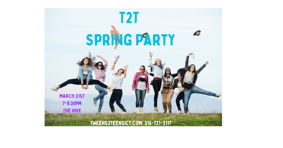 T2T Spring Party Friday, March 31, 2023 7:00 PM 8:30 PM Tweens 2 Teens 200 North Broadway Avenue Wichita, KS, 67202 United States (map) Google Calendar ICS